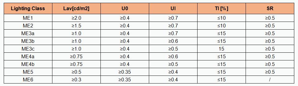 There are different standards for driveways and sidewalks. We have included two tables below based on the EN13201 standard to give you a quick overview of the relevant standards. The table below is for freeways and sidewalks respectively. As you can see, it includes Lav (Eav, Emin), U0, UI, TI and SR requirements. Of course, there are other lighting classes besides M and P. For example, Lighting Class C applies to conflicts. Lighting class C, for example, applies to conflict zones. Often, projects or tenders require protection classes for luminaires.